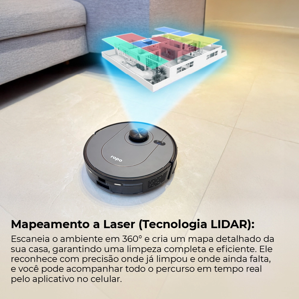 Com nossa tecnologia LIDAR de última geração, o ROPO SENSE mapeia sua casa com leitura por laser e precisão milimétrica, criando um mapa 3D detalhado que garante 100% de cobertura. Nem um grão de poeira escapa! E o melhor: você acompanha tudo em tempo real pelo celular, no aplicativo (Tuya ou Smart Life). Agende a limpeza para quando você não estiver em casa, defina áreas de exclusão ou paredes virtuais e ajuste a potência da aspiração ou a umidade do pano para cada cômodo. Ele também é compatível com Alexa e Google Home.